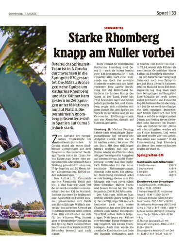 Österreichs Springreit-Team ist in A Coruña durchwachsen in die Springreit-EM gestartet. Die 2023 zu Bronze gerittene Equipe um Katharina Rhomberg und Max Kühner kam gestern im Zeitspringen unter 18 Nationen nur auf Platz 11. Die Dornbirnerin Rhomberg präsentierte sich in Spanien auf Cuma 5 jedoch stark.