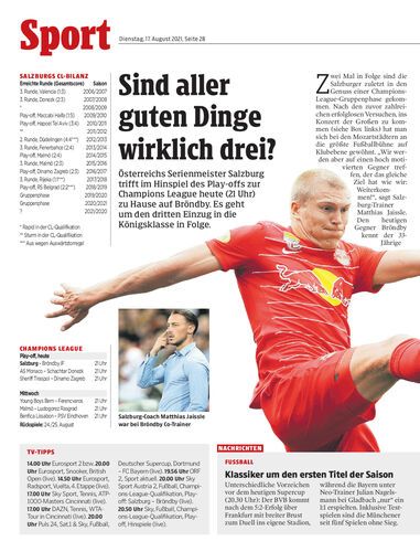 Österreichs Serienmeister Salzburg trifft im Hinspiel des Play-offs zur Champions League heute (21 Uhr) zu Hause auf Bröndby. Es geht um den dritten Einzug in die Königsklasse in Folge.