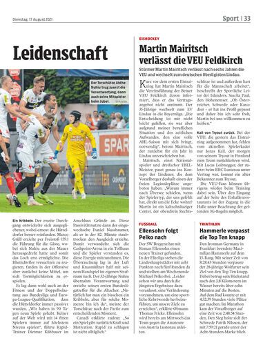 Stürmer Martin Mairitsch verlässt nach sechs Jahren die VEU und wechselt zum deutschen Oberligisten Lindau.