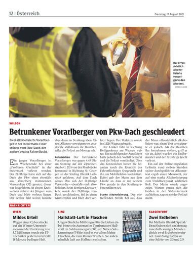 Zwei alkoholisierte Vorarlberger in der Steiermark: Einer stürzte vom Pkw-Dach, der andere beging Fahrerflucht.