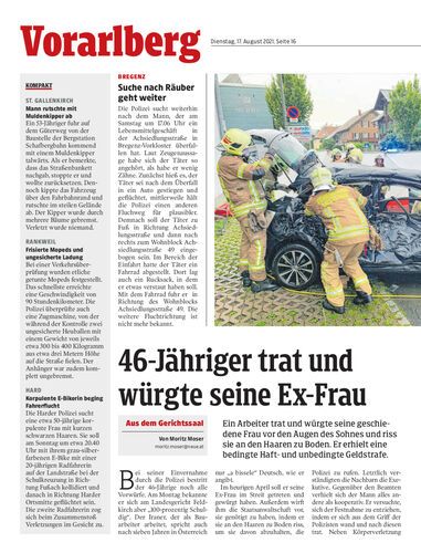 Ein Arbeiter trat und würgte seine geschiedene Frau vor den Augen des Sohnes und riss sie an den Haaren zu Boden. Er erhielt eine bedingte Haft- und unbedingte Geldstrafe.