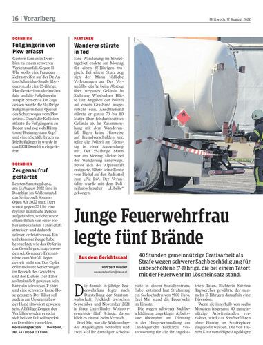 40 Stunden gemeinnützige Gratisarbeit als Strafe wegen schwerer Sachbeschädigung für unbescholtene 17-Jährige, die bei einem Tatort mit der Feuerwehr im Löscheinsatz stand.