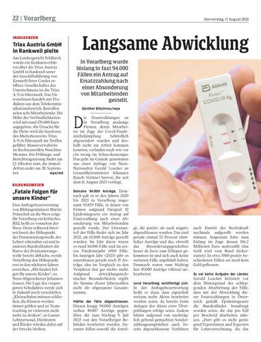 In Vorarlberg wurde bislang in fast 94.000 Fällen ein Antrag auf Ersatzzahlung nach einer Absonderung von Mitarbeitenden gestellt.