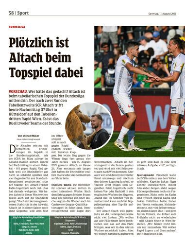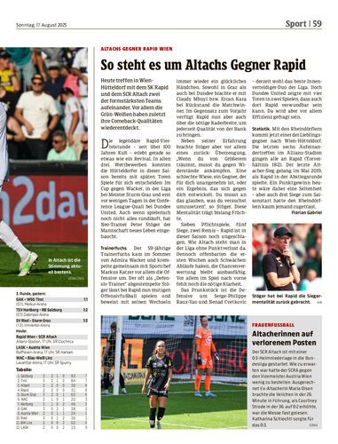 Vorschau. Wer hätte das gedacht? Altach ist beim tabellarischen Topspiel der Bundesliga mittendrin. Der nach zwei Runden Tabellenzweite SCR Altach trifft heute Nachmittag (17 Uhr) in Hütteldorf auf den Tabellendritten Rapid Wien. Es ist das Duell zweier Teams der Stunde.