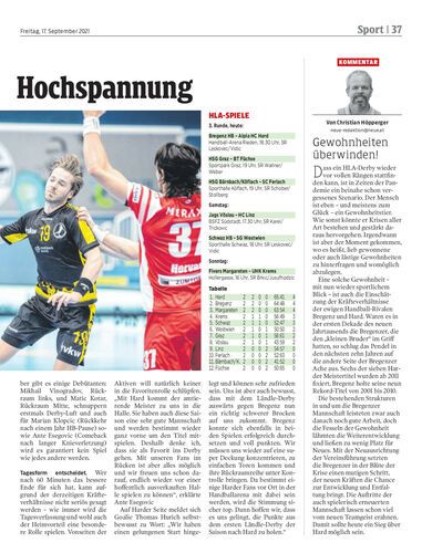 Ein Favorit ist heute (18.30 Uhr) im ersten Derby der Saison zwischen Bregenz HB und HC Hard schwer auszumachen. Eine volle Halle wird erwartet beim Kampf um die Tabellenführung.