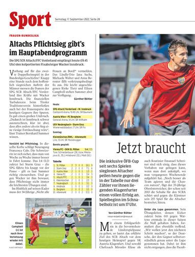 Die SPG SCR Altach/FFC Vorderland empfängt heute (19.45 Uhr) den kolportierten Fixabsteiger Wacker Innsbruck.