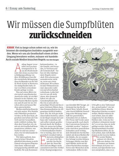 ESSAY. Viel zu lange schon sehen wir zu, wie im Internet die niedrigsten Instinkte ausgelebt werden. Wenn wir uns als Gesellschaft einen zivilen Umgang bewahren wollen, müssen wir handeln: Auch soziale Medien brauchen Regeln. Von Veit Dengler