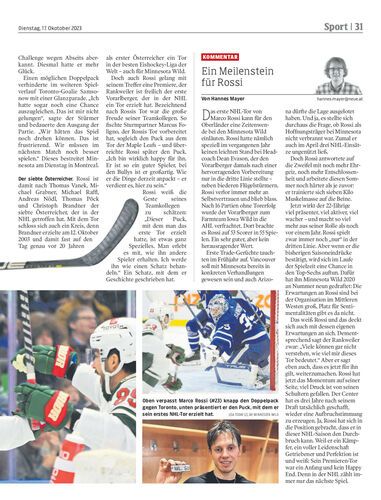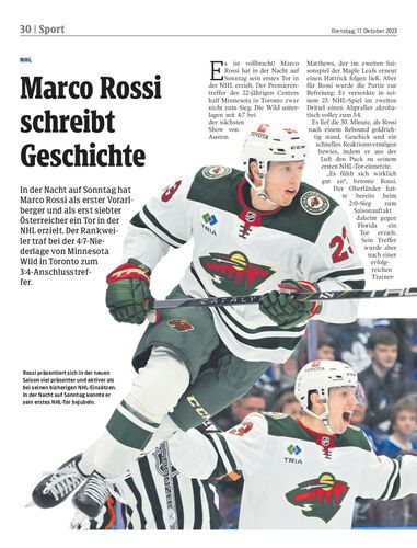 In der Nacht auf Sonntag hat Marco Rossi als erster Vorarlberger und als erst siebter Österreicher ein Tor in der NHL erzielt. Der Rankweiler traf bei der 4:7-Niederlage von Minnesota Wild in Toronto zum 3:4-Anschlusstreffer.