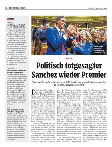 Spanien: Pedro Sánchez wurde mit Unterstützung von Regionalparteien im Parlament wiedergewählt.