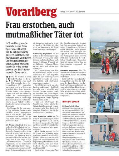In Vorarlberg wurde neuerlich eine Frau Opfer einer Bluttat. Die 35-Jährige wurde gestern in Hohenems mutmaßlich von ihrem Lebensgefährten getötet. Auch der Mann starb. Es wäre heuer bereits der 30. Frauenmord in Österreich.