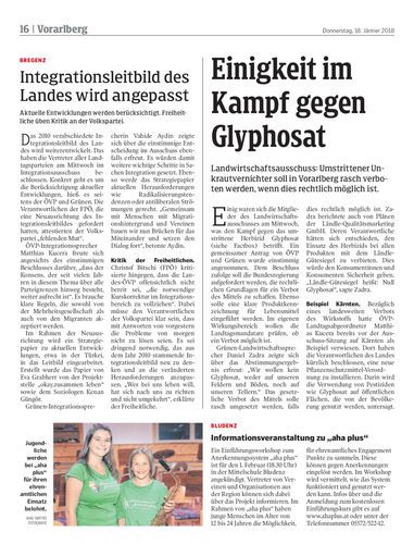 Landwirtschaftsausschuss: Umstrittener Unkrautvernichter soll in Vorarlberg rasch verboten werden, wenn dies rechtlich möglich ist.