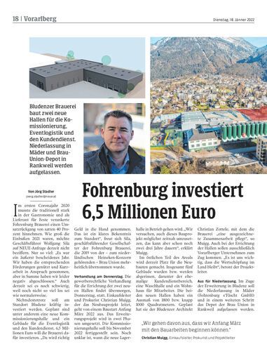 Bludenzer Brauerei baut zwei neue Hallen für die Komissionierung, Eventlogistik und den Kundendienst. Niederlassung in Mäder und Brau-Union-Depot in Rankweil werden aufgelassen.