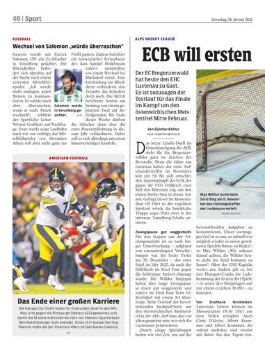 Der EC Bregenzerwald hat heute den EHC Lustenau zu Gast. Es ist sozusagen der Testlauf für das Finale im Kampf um den österreichischen Meistertitel Mitte Februar.