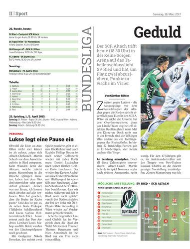 Der SCR Altach trifft heute (18.30 Uhr) in der Keine Sorgen Arena auf das Tabellenschlusslicht SV Ried und hat, um Platz zwei abzusichern, Punktezuwachs im Visier.