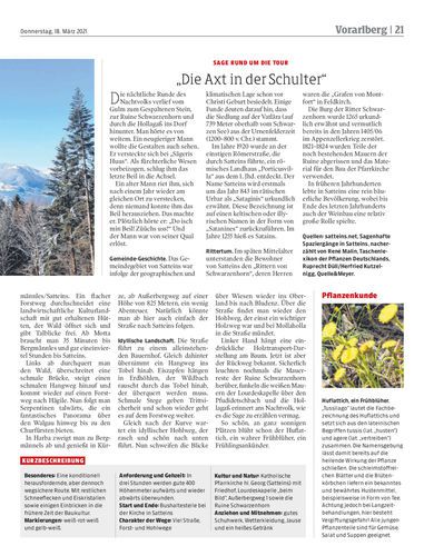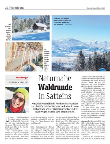 Geschichtenerzählerin Hertha Glück wandert von der Pfarrkirche Satteins zur Ruine Schwarzenhorn und weiter bis knapp vor Gartis. Der Rückweg führte sie über Bergmännles.