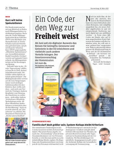 Impfzertifikat. Die EU schafft ein digitales Zertifikat, das Geimpften und Getesteten schon bald neue Reisefreiheit bringen soll – mit Einschränkungen. Eine Impfung wird aber keine Voraussetzung für das Reisen sein. Seiten 2/3 APA