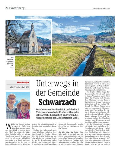 Wanderführer Hertha Glück und Gerhard Vylet wandern ab der Kirche entlang der Schwarzach, durchs Ried und vom Industriegebiet über den „Pfellerpfiefer-Weg“.