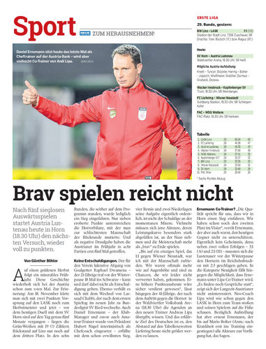 Nach fünf sieglosen Auswärtsspielen startet Austria Lustenau heute in Horn (18.30 Uhr) den nächs-ten Versuch, wieder voll zu punkten.