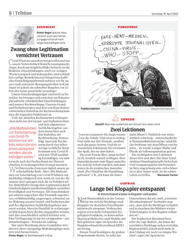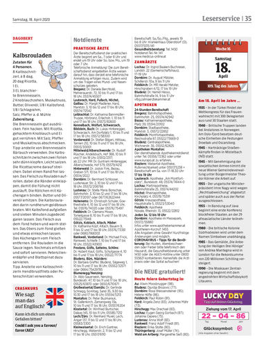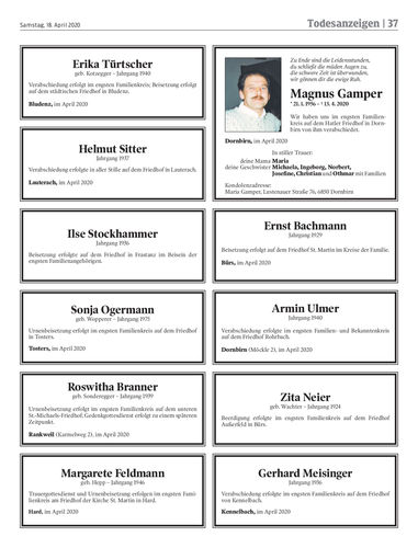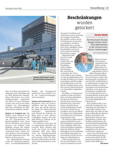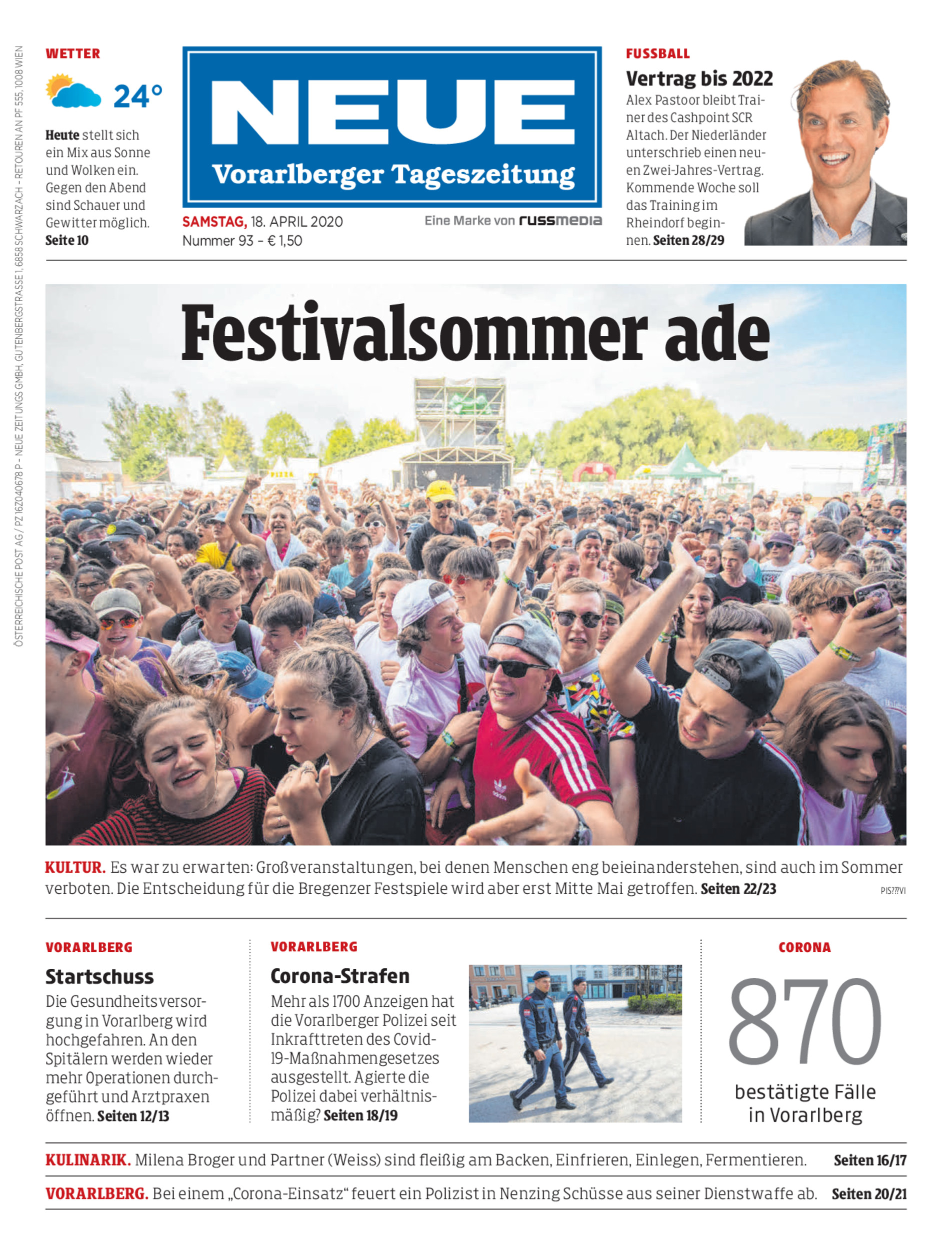 Kultur. Es war zu erwarten: Großveranstaltungen, bei denen Menschen eng beieinanderstehen, sind auch im Sommer verboten. Die Entscheidung für die Bregenzer Festspiele wird aber erst Mitte Mai getroffen. Seiten 22/23 PIS???VI