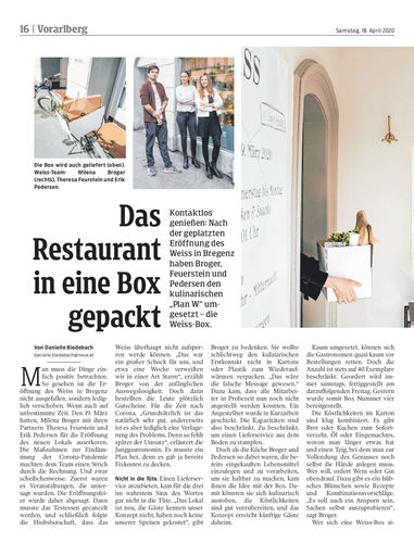 Kontaktlos genießen: Nach der geplatzten Eröffnung des Weiss in Bregenz haben Broger, Feuerstein und Pedersen den kulinarischen „Plan W“ umgesetzt – die Weiss-Box.