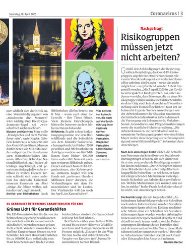 Erleichterungen ab Mitte Mai für Museen und Profibühnen. Open-Air-Großevents sind bis Ende August verboten. Bei Festivals wie in Salzburg ist noch nichts entschieden.