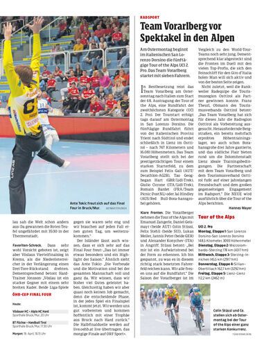 Am Ostermontag beginnt im italienischen San Lorenzo Dorsino die fünftägige Tour of the Alps UCI 2. Pro. Das Team Vorarlberg startet mit sieben Fahrern.