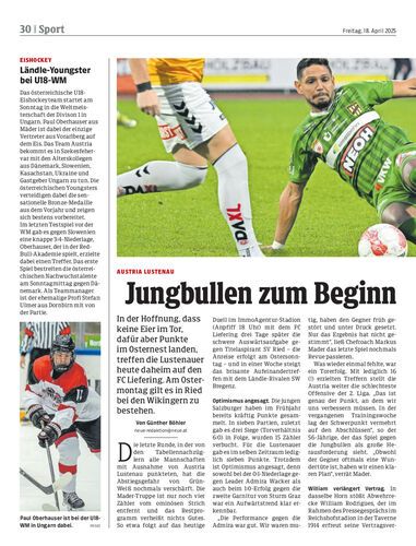 In der Hoffnung, dass keine Eier im Tor, dafür aber Punkte im Osternest landen, treffen die Lustenauer heute daheim auf den FC Liefering. Am Ostermontag gilt es in Ried bei den Wikingern zu bestehen.