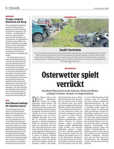 Ein Meter Neuschnee in der Schweiz, Wind und Niederschläge in Italien. Zermatt ist abgeschnitten.