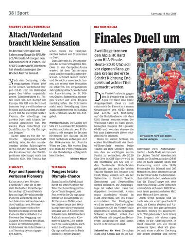 Im letzten Heimspiel der Saison empfängt die SPG Altach/Vorderland morgen den Tabellenführer St. Pölten. Die SPG FC Lustenau/FC Dornbirn hat ebenfalls morgen die Wiener Austria zu Gast.