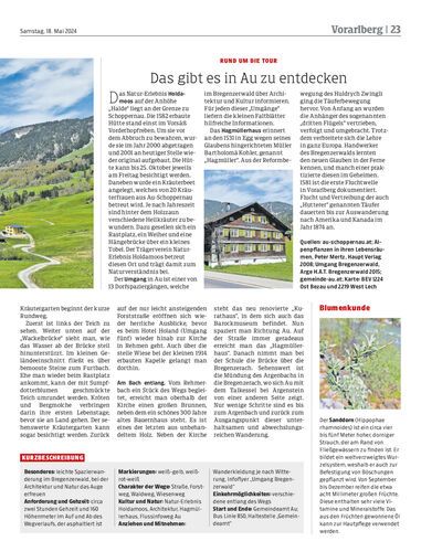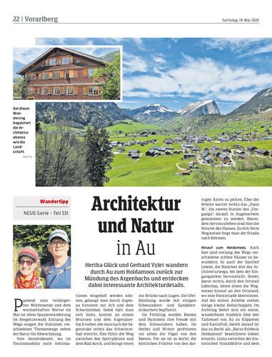 Hertha Glück und Gerhard Vylet wandern durch Au zum Holdamoos zurück zur Mündung des Argenbachs und entdecken dabei interessante Architekturdetails.