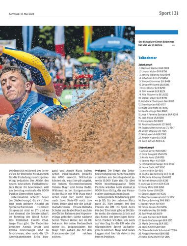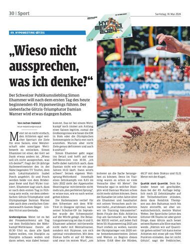 Der Schweizer Publikumsliebling Simon Ehammer will nach dem ersten Tag des heute beginnenden 49. Hypomeetings führen. Der siebenfache Götzis-Triumphator Damian Warner wird etwas dagegen haben.