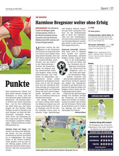 Spielbericht. Der Abwärtstrend von Bregenz geht schonungslos weiter. In der Monte Schlacko Arena mussten sich die Schwarz-Weißen dem DSV Leoben mit 0:2 geschlagen geben.