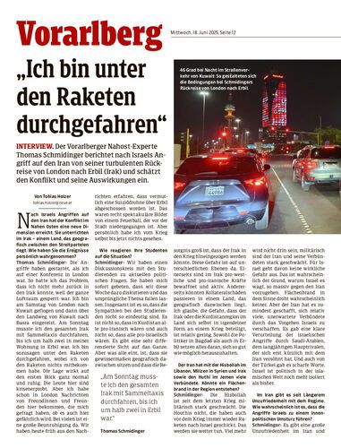 Interview. Der Vorarlberger Nahost-Experte Thomas Schmidinger berichtet nach Israels Angriff auf den Iran von seiner turbulenten Rückreise von London nach Erbil (Irak) und schätzt den Konflikt und seine Auswirkungen ein.