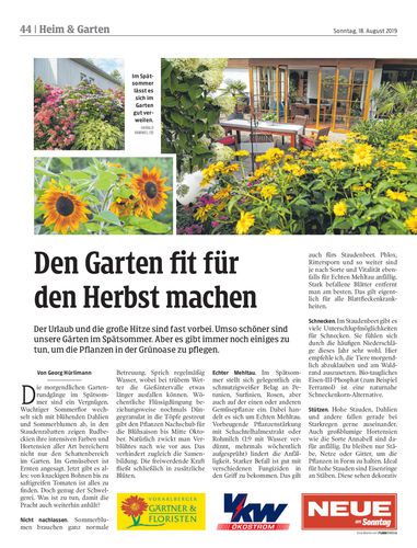 Der Urlaub und die große Hitze sind fast vorbei. Umso schöner sind unsere Gärten im Spätsommer. Aber es gibt immer noch einiges zu tun, um die Pflanzen in der Grünoase zu pflegen.