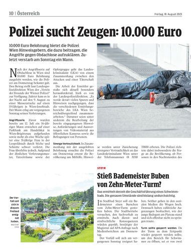 10.000 Euro Belohnung bietet die Polizei Wien Hinweisgebern, die dazu beitragen, die Angriffe gegen Obdachlose aufzuklären. Zuletzt verstarb am Sonntag ein Mann.