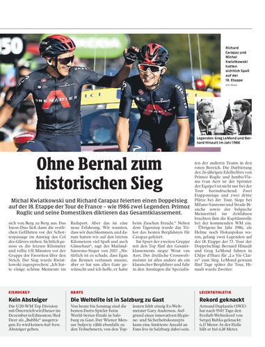Michal Kwiatkowski und Richard Carapaz feierten einen Doppelsieg auf der 18. Etappe der Tour de France – wie 1986 zwei Legenden. Primoz Roglic und seine Domestiken diktieren das Gesamtklassement.