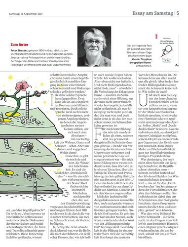 Essay. Was also wäre Bildung? Belehrte Sehnsucht – die Sehnsucht, in den Dingen einen Abglanz jener Geistigkeit wiederzufinden, die uns beseelt, sobald wir uns zur Welt hin öffnen. Von Peter Strasser