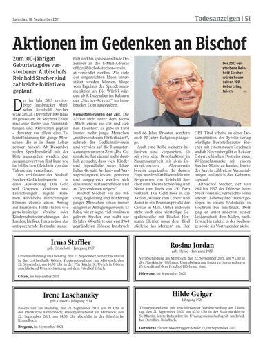 Zum 100-jährigen Geburtstag des verstorbenen Altbischofs Reinhold Stecher sind zahlreiche Initiativen geplant.