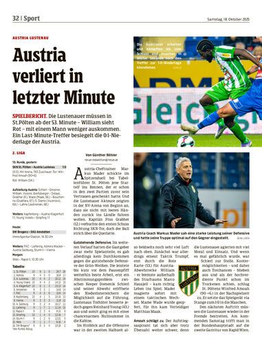 Spielbericht. Die Lustenauer müssen in St.Pölten ab der 53. Minute – William sieht Rot – mit einem Mann weniger auskommen. Ein Last-Minute-Treffer besiegelt die 0:1-Niederlage der Austria.