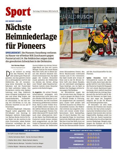 Spielbericht. Die Pioneers Vorarlberg verlieren zu Hause vor offenbar 1616 Zuschauern gegen Pustertal mit 2:4. Die Feldkircher zeigen dabei die gewohnten Schwächen in der Defensive.