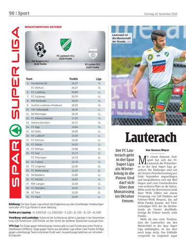 Der FC Lauterach geht in der Spar Super Liga als Winterkönig in die Pause. Und darf sich über den Monatssieg im Oktober freuen.