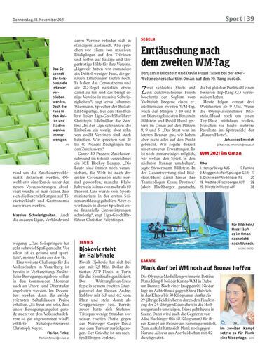 Benjamin Bildstein und David Hussl fallen bei der 49er-Weltmeisterschaft im Oman auf den 19. Rang zurück.