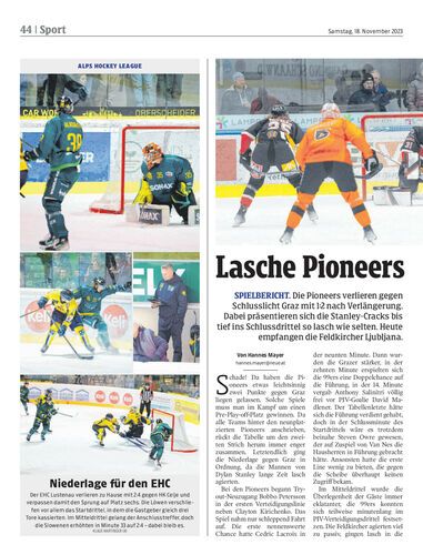 Spielbericht. Die Pioneers verlieren gegen Schlusslicht Graz mit 1:2 nach Verlängerung. Dabei präsentieren sich die Stanley-Cracks bis tief ins Schlussdrittel so lasch wie selten. Heute empfangen die Feldkircher Ljubljana.