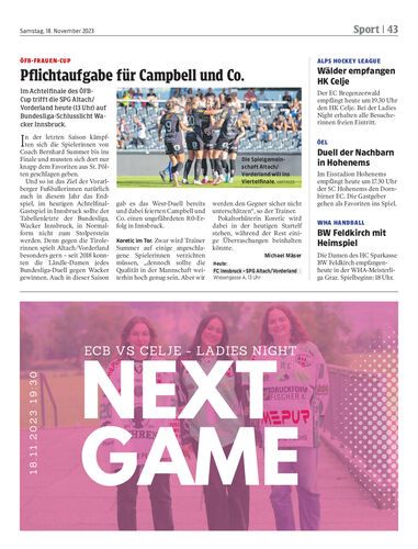 Im Achtelfinale des ÖFB-Cup trifft die SPG Altach/Vorderland heute (13 Uhr) auf Bundesliga-Schlusslicht Wacker Innsbruck.