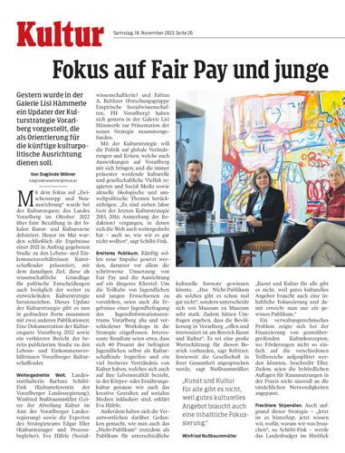Gestern wurde in der Galerie Lisi Hämmerle ein Updater der Kulturstrategie Vorarlberg vorgestellt, die als Orientierung für die künftige kulturpolitische Ausrichtung dienen soll.