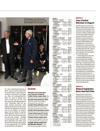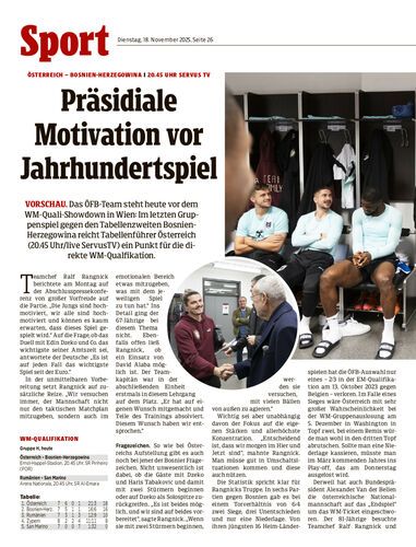 Vorschau. Das ÖFB-Team steht heute vor dem WM-Quali-Showdown in Wien: Im letzten Gruppenspiel gegen den Tabellenzweiten Bosnien-Herzegowina reicht Tabellenführer Österreich (20.45 Uhr/live ServusTV) ein Punkt für die direkte WM-Qualfikation.