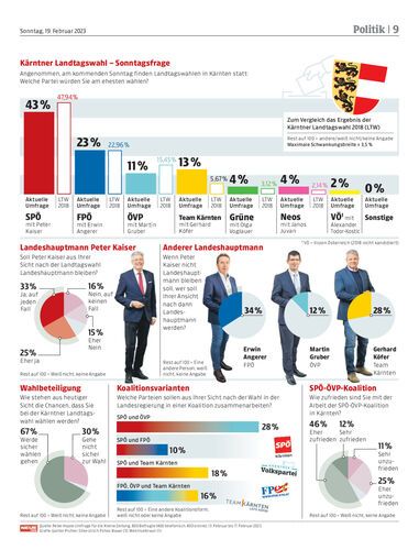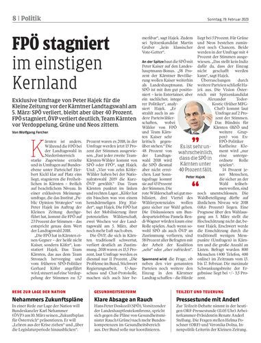 Exklusive Umfrage von Peter Hajek für die Kleine Zeitung vor der Kärntner Landtagswahl am 5. März: SPÖ verliert, bleibt aber über 40 Prozent. FPÖ stagniert, ÖVP verliert deutlich, Team Kärnten vor Verdoppelung, Grüne und Neos zittern. Von Wolfgang Fercher