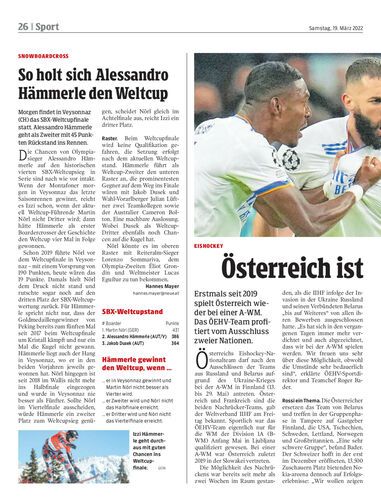Morgen findet in Veysonnaz (CH) das SBX-Weltcupfinale statt. Alessandro Hämmerle geht als Zweiter mit 45 Punkten Rückstand ins Rennen.