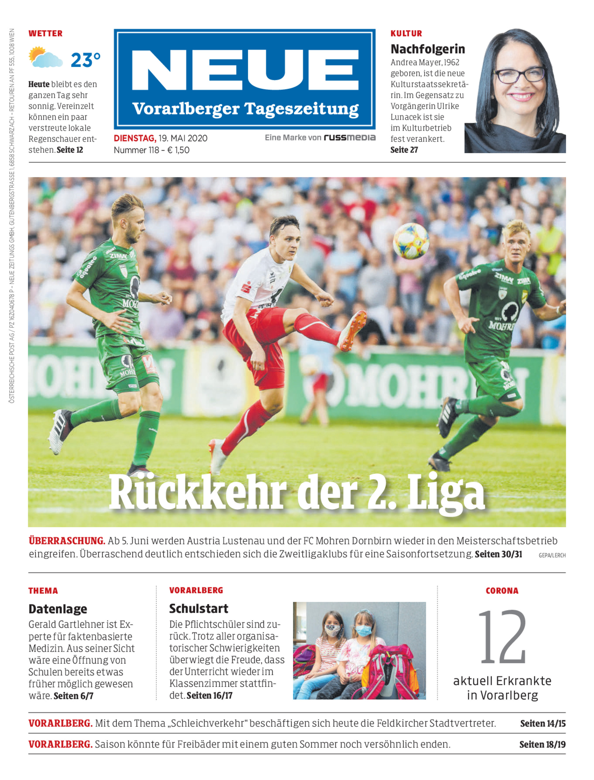 Überraschung. Ab 5. Juni werden Austria Lustenau und der FC Mohren Dornbirn wieder in den Meisterschaftsbetrieb eingreifen. Überraschend deutlich entschieden sich die Zweitligaklubs für eine Saisonfortsetzung. Seiten 30/31 Gepa/Lerch