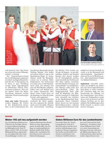 Kultur. Sonderregeln gelten ab heute für den Amateurbereich wie Blasmusikvereine, Chöre oder das Amateurtheater. Bei Proben und Aufführungen sorgt etwa die 20-Quadratmeter-Regel für Probleme. Seiten 30/31 Matthias Rhomberg